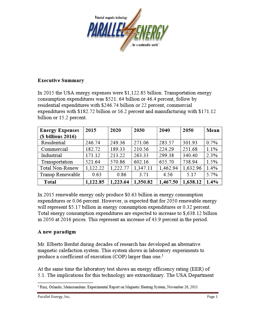 Our innovative “parallel energy” technology is based on the interaction between permanent rare-earth magnets and aluminum or copper.  The interaction produces a chemical reaction that accelerates the electrons of the aluminum or copper, colliding with each other and creating heat. Temperatures reaching hundreds of degrees Celsius and efficiencies of 1 to 2 are achieved; in other words, for every 1,000 watts of energy consumed, this revolutionary technology produces 2,000 watts of heat. The energy savings is 50 to 60%.