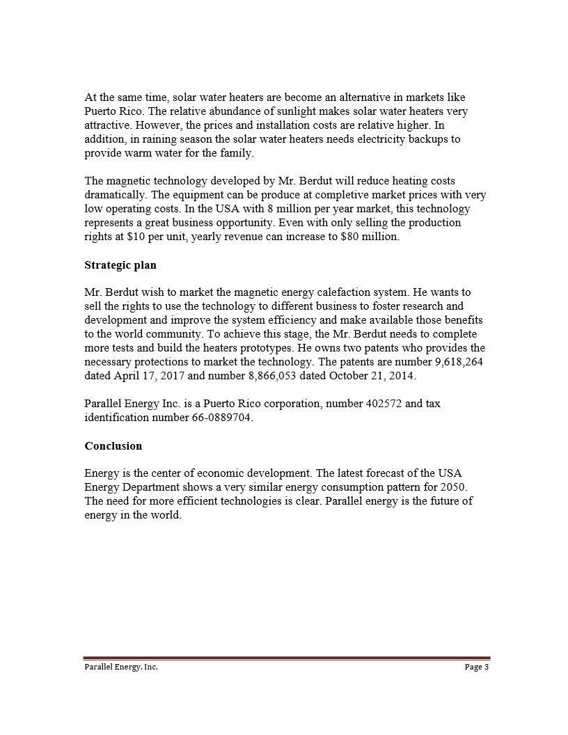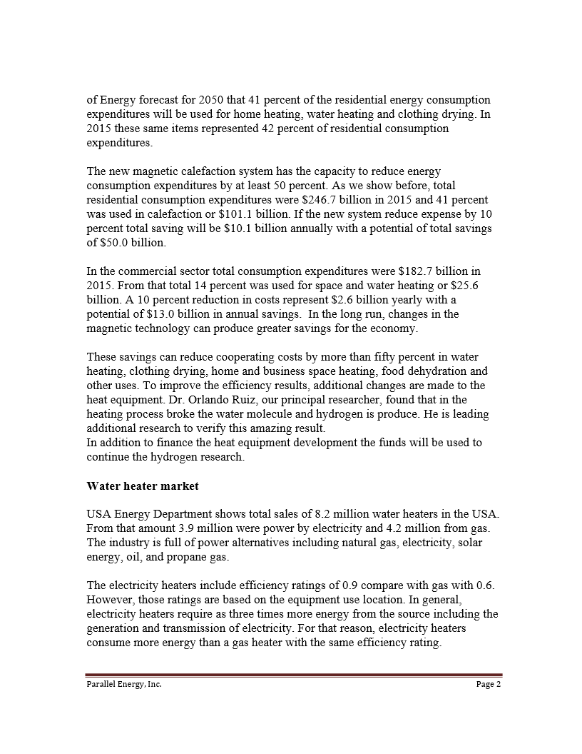 The marketing of our revolutionary Parallel Energy technology will be effected through the sale of rights for the life of he patent, either via exclusive or partial rights, by countries or specific zones for each use or application.  We will produce actual functioning prototypes or graphic simulations, always guaranteeing the efficiency and performance of each device to ensure the quality of the rights offered.  We will have a laboratory with specialists and experts in the performance of this technology and will have individual patents for each device and its function. The sale of rights will primarily be made to industrial corporations related to the offered technology.  Royalties and commissions will be required from the sale of each appliance as well as spare parts and a participation in any resale of rights to other interested parties. Parallel Energy Inc., is willing to partner with serious brands and entrepreneurs having the capacity to develop new appliances featuring the quality required by consumers.  We are open to evaluating proposals, new ideas and will continue this revolutionary research in our laboratory and workshop for the benefit of consumers and our new associates.